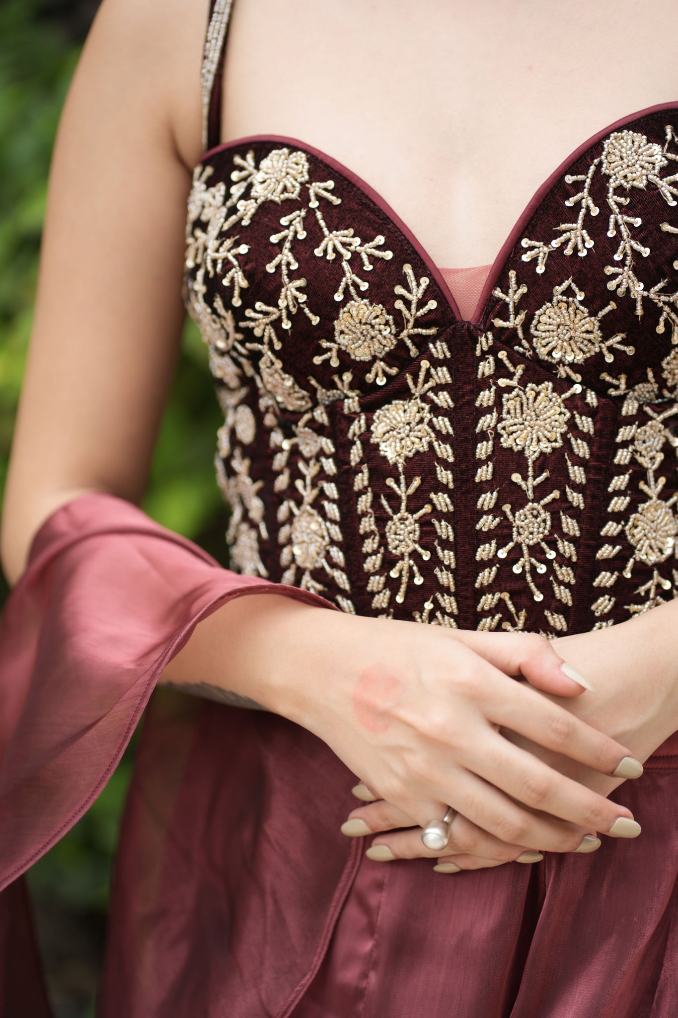 Maroon velvet corset with embroidery details. Team perfectly with a jimmy choo lehnga and a single layer wave dupatta. Simple and stylish all the way !!