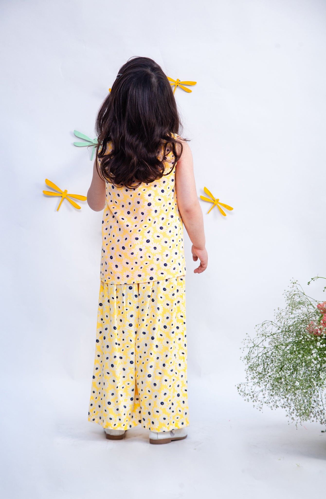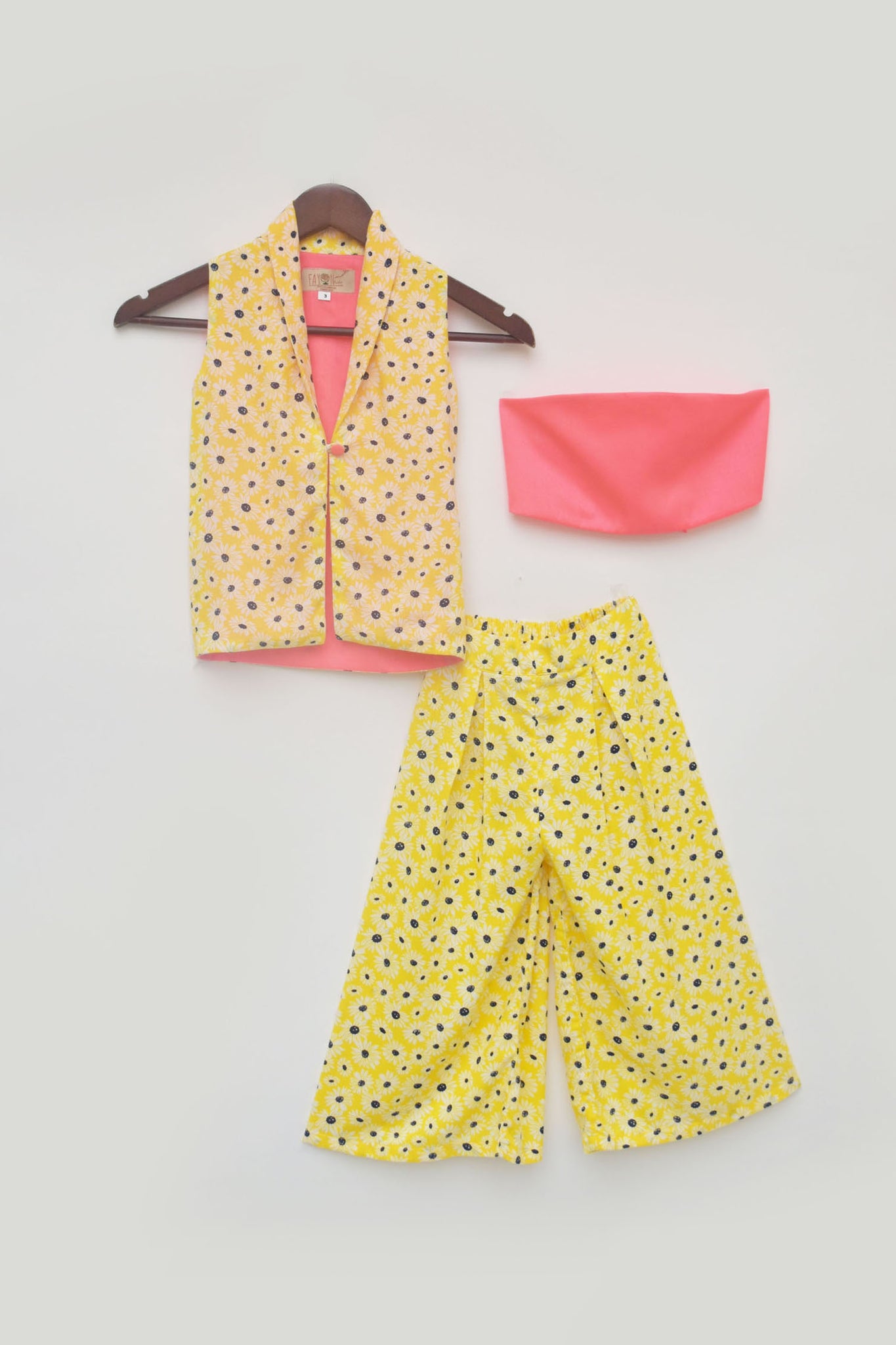 Girls Pink Knotted Top With Printed Jacket And Pant by Fayon Kids.
