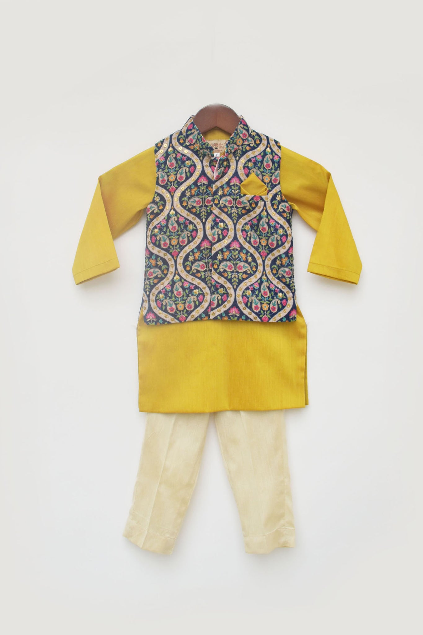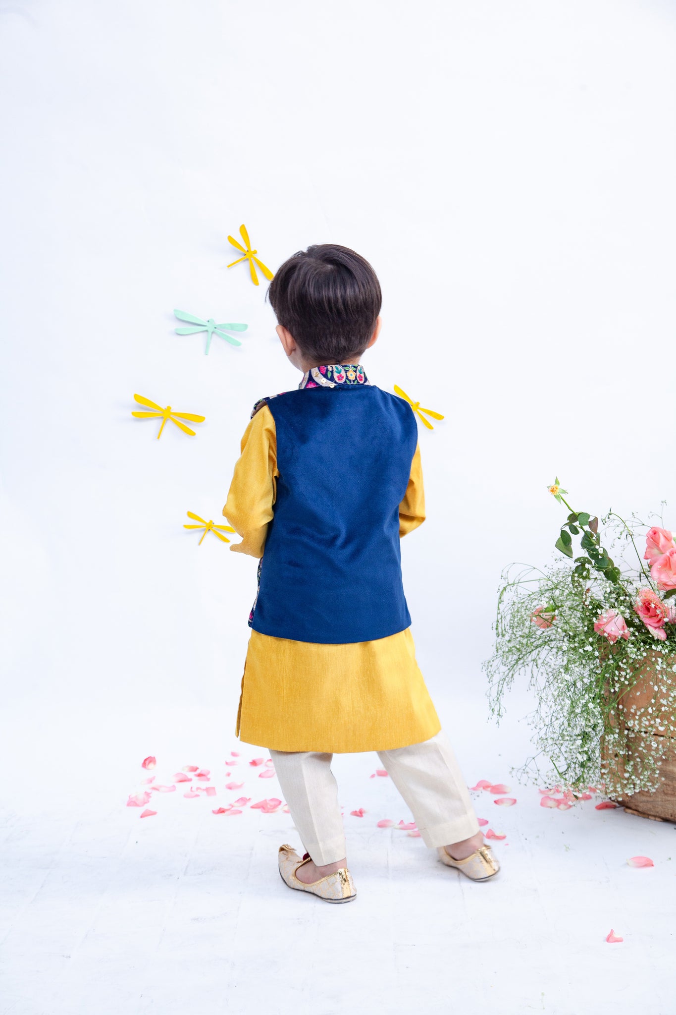 Boys Blue Embroidery Velvet Nehru Jacket With Kurta And Pant by Fayon Kids.