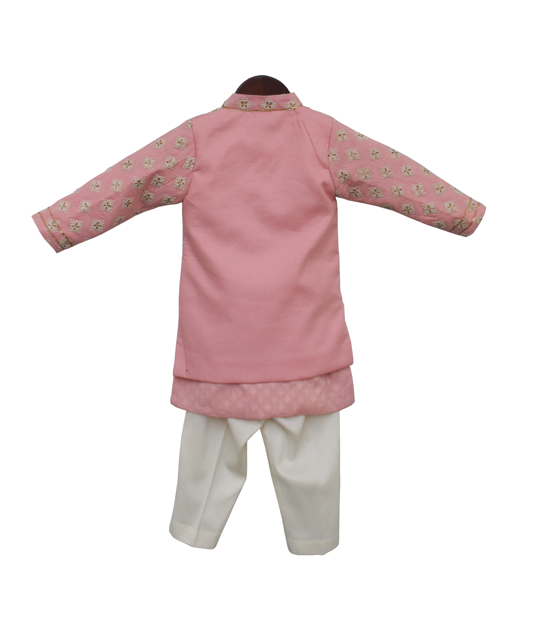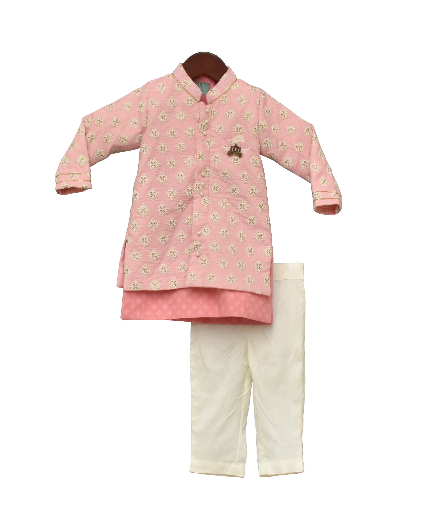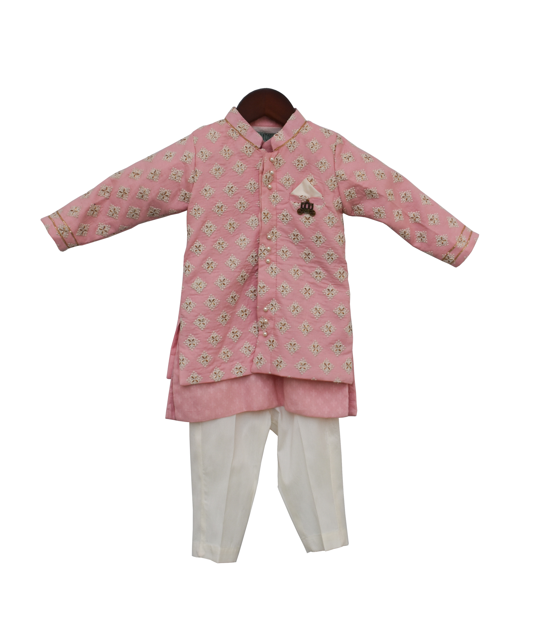 Boys Pastel Pink Embroidery Jacket With Kurta And Pant by Fayon Kids.