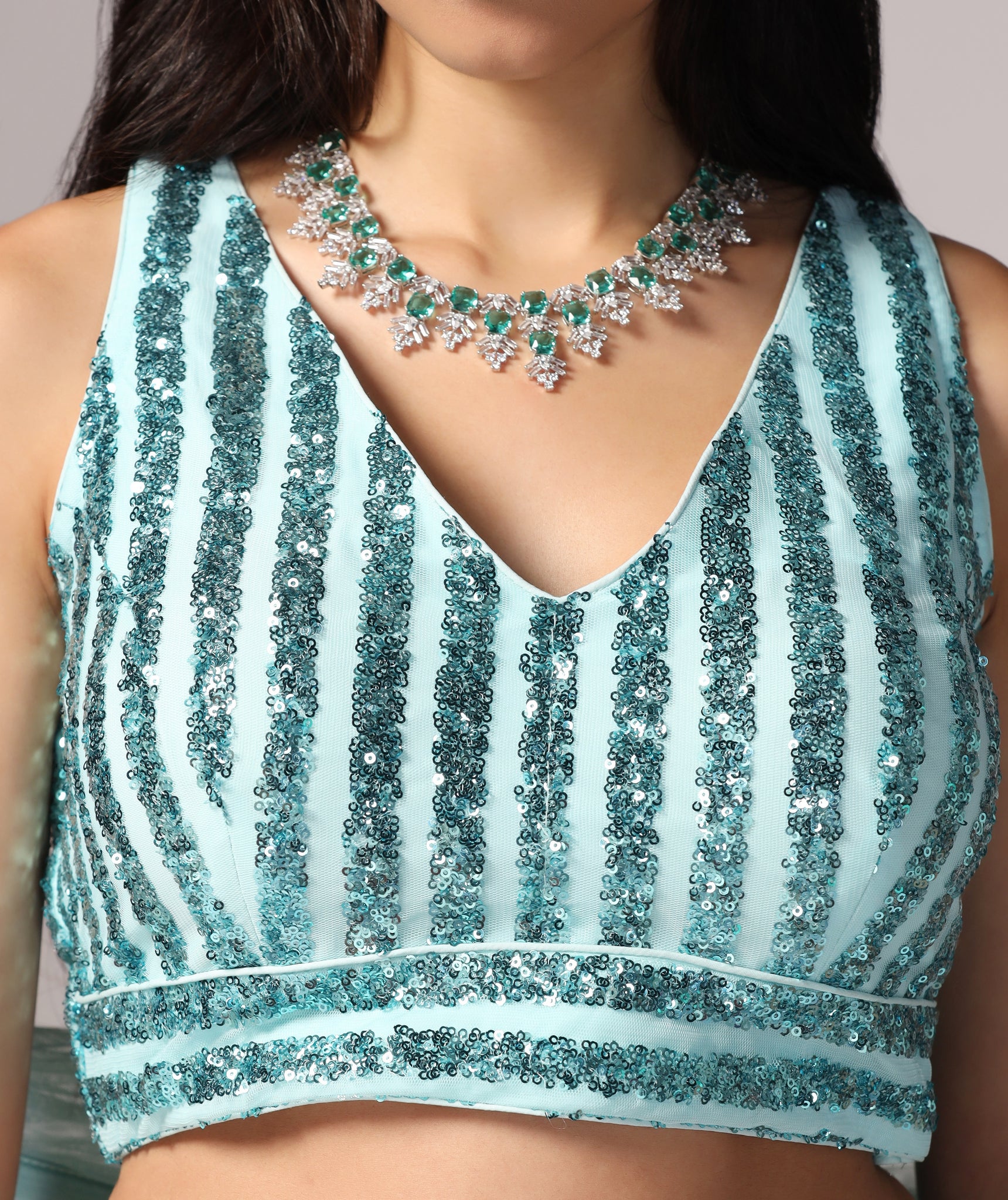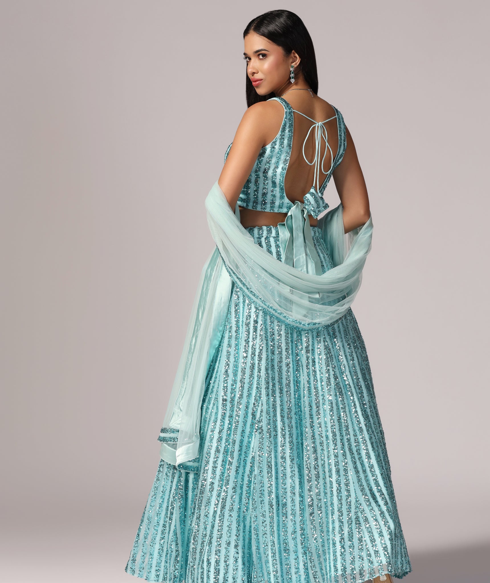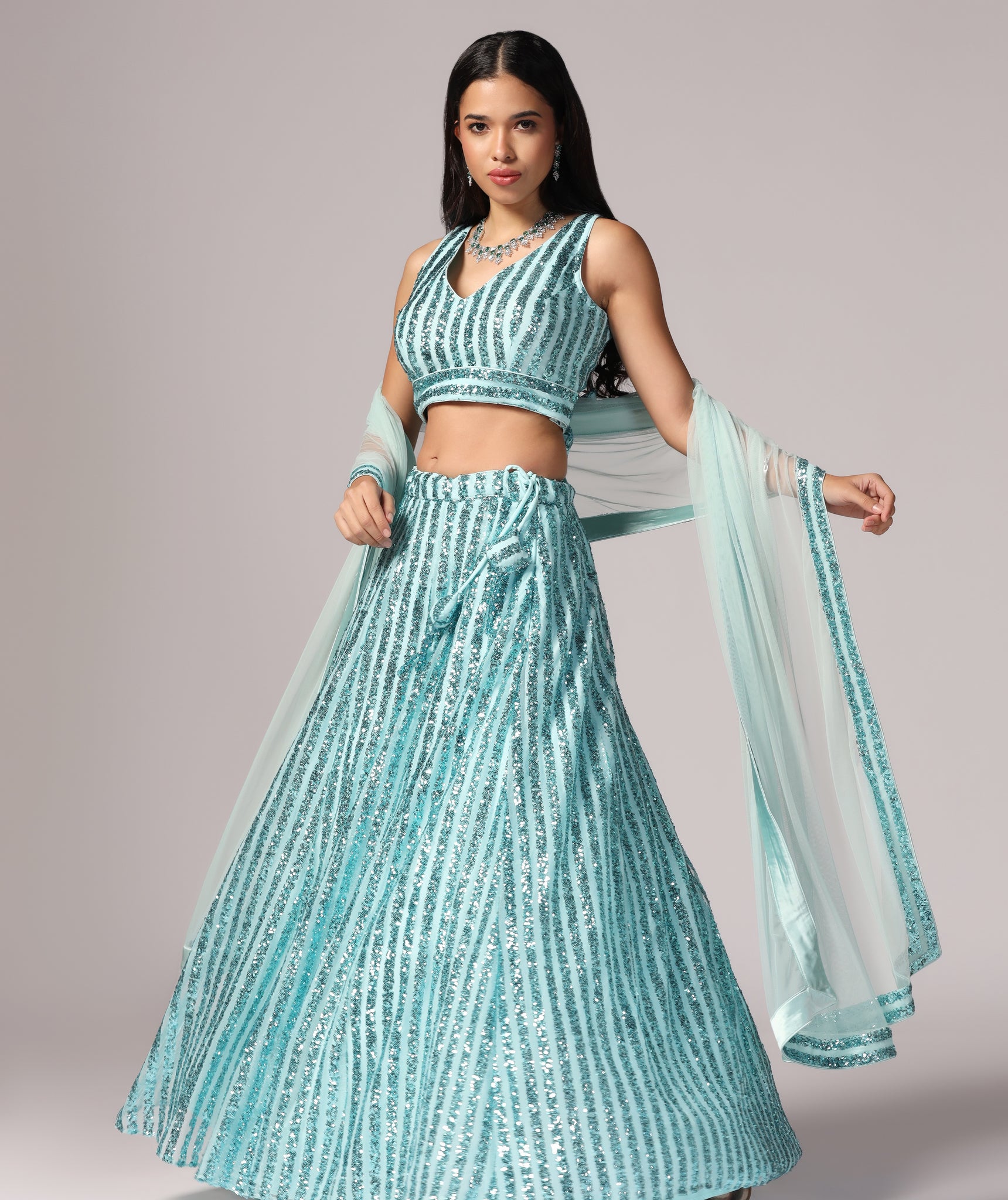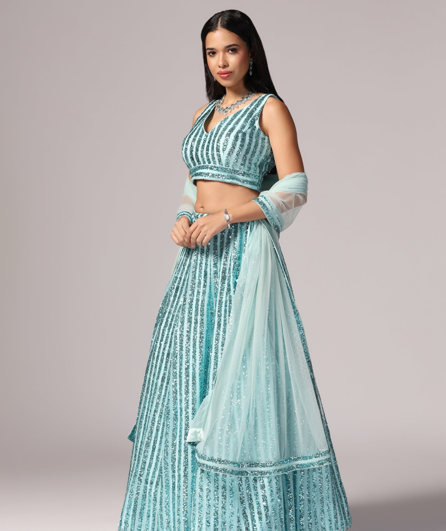 Featuring a lehnga in a gorgeous shade of teal in sequins. It is teamed perfectly with a embroidery V-neck blouse in the same material. A simple yet elegant dupatta completes this whole look.